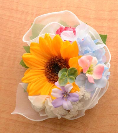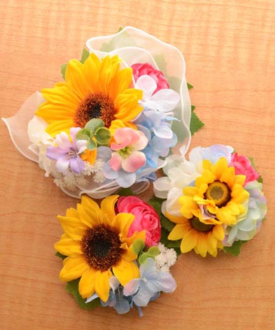 ひまわり、アジサイ、カスミソウ、ブロッサムスプレー、ラナンキュラス、その他